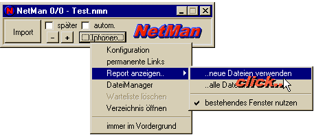 1.) Nach dem Abschluß des Ladevorganges oder auch während NetMan noch lädt können die bis jetzt geladenen Dateien mittels des von NetMan generierten Reports betrachtet werden. (Dies kann auch automatisch geschehen, wenn der Ladevorgang beendet ist - je nach Voreinstellung im Konfigurationsmenü):